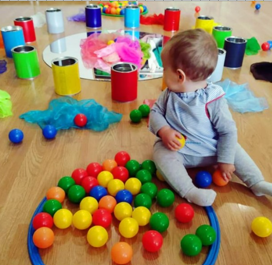 Consiste en colocar un espejo en el suelo* rodeado de botes de diferentes colores, tela de tul y pelotas.